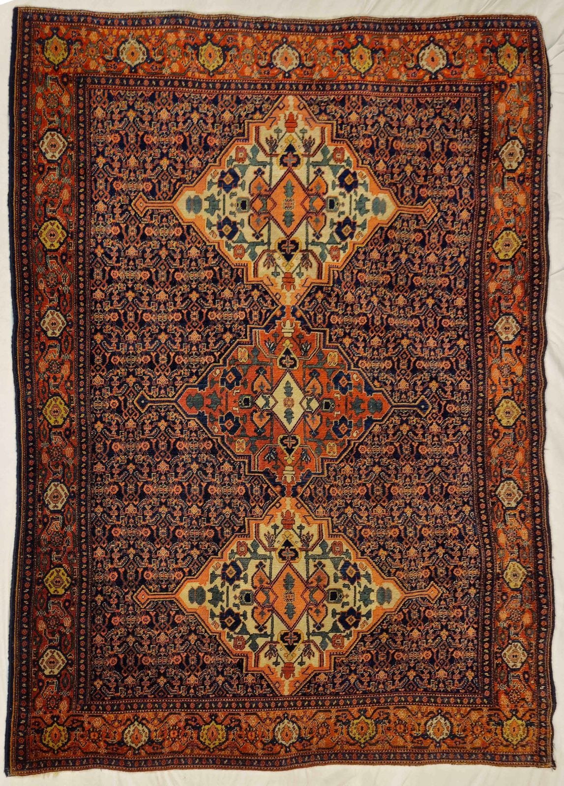 Senneh rugs are produced in the town of Sanandaj which is the capital city in the province of Kurdistan. The population of this area primary consists of people of Kurdish descent. The weaving style although symmetrical is very unique compared to other carpets of Iran and hence can be easily identified from the back of the pile. Although Sennah's are finely woven, due to its unique structure, the body of a Sennah rug is much thinner than that of a bidjar. The designs that are typically and traditionally utilized on Sennah rugs are one to three central, lozenge-shaped medallions on a dark-blue field comprising of small geometrically shaped Herati motifs. Other designs that may be used are boteh patterns, or flower bouquets spread throughout the field of the carpet. Today the traditional Sennah patterns are becoming rarer as the production of handmade goods is decreasing due to the industrialization of Iran as a whole. Most Sennah rugs are produced in smaller sizes(120-140x200-230) although larger do exist. This province also produces a large amount of the finest kilims available in the region. There designs are crisp, fine and utilize strong colors (blue, red, orange, white, beige). The Kilims have similar patterns and motifs to the Sennah rugs.