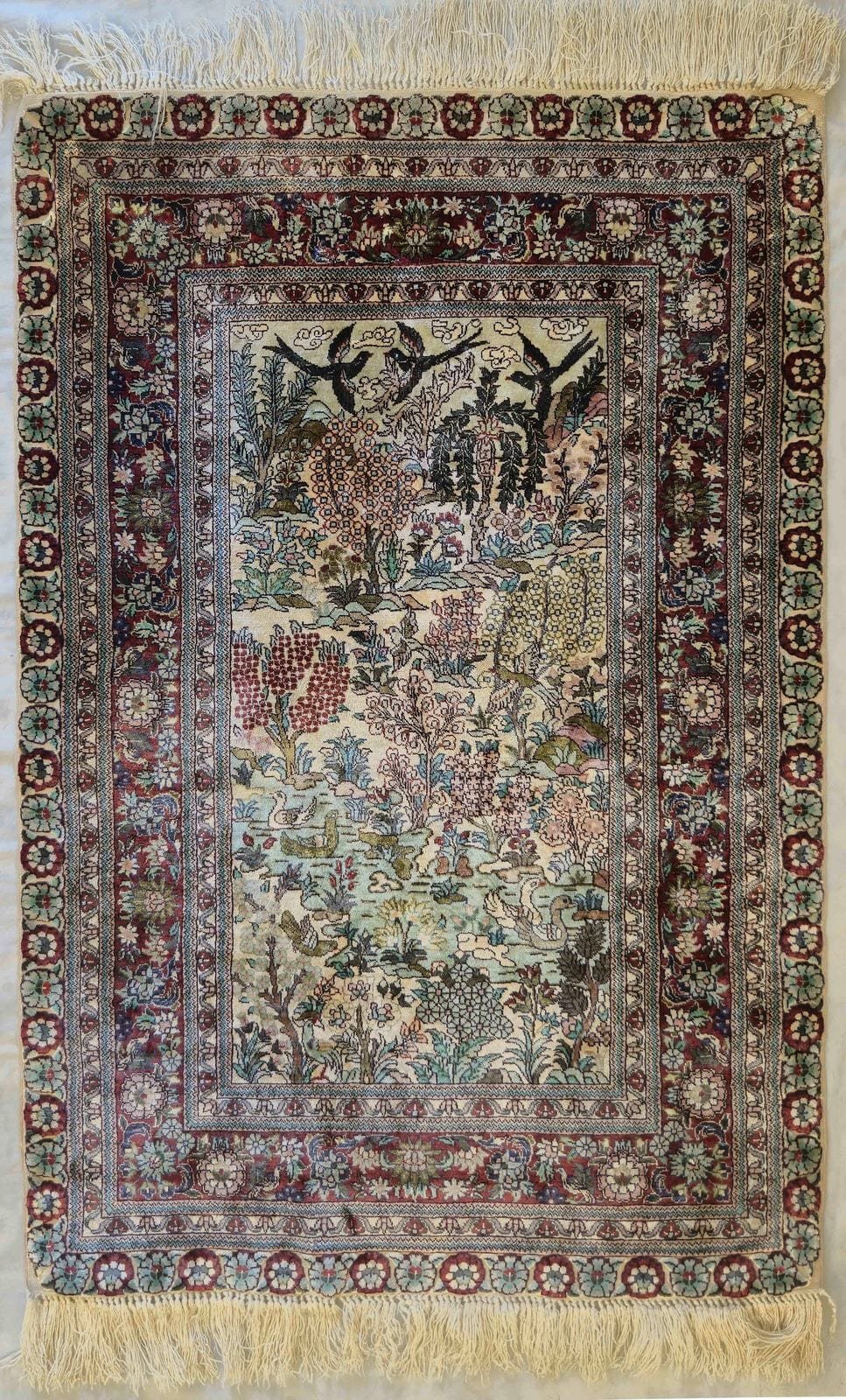 The manufacturing of the fine quality silk carpets in China started 25-30 years ago, for which the best quality silk produced in the country is used. For most of the designs Persian motifs adopted from Iranian master workshops are used (Tabriz, Qom, Isfahan, Kerman Ravar). The most typical motifs show the Garden of Paradise or a garden scene. Flower motifs appear as well, covering the surface of the carpet, either with or without medallion in the middle. A fineness of the Chinese rugs is usually measured by the number of yarns (threads) in one foot (30,48 cm). The most well-known fineness-types are marked as 150, 260, 300, 400; more rare are the 500, 600, 700, 800 yarn carpets. A carpet with 300 yarns has around 1 million knot/m2, as there is 300 yarns in a foot (305 mm), which results in 1 knot/mm2. The quality of the silk is excellent, which gives the carpets durability and permanence. The more fine ones (with 500-800 yarns) take a lot of time and specialized knowledge, therefore they are not profitable for most of the workshops, so they become more and more rare. Nowadays the most common type is the one with 150-200 yarns, which rugs are beautiful and are available at a fair price. These carpets keep their value very well and will be more available as the silk manufacturing in Iran is decreasing, and the value of the carpets are rising as time goes by.