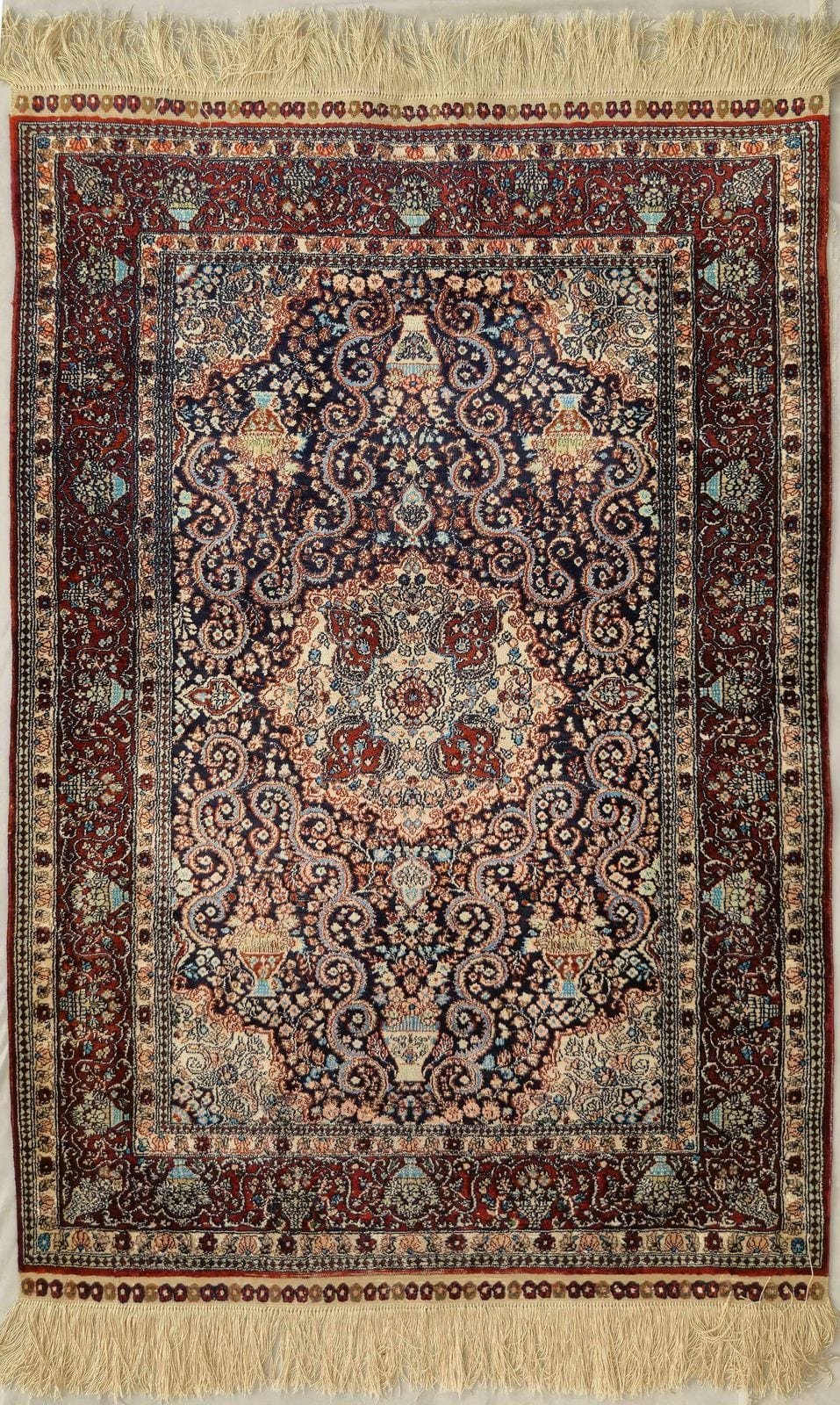 The manufacturing of the fine quality silk carpets in China started 25-30 years ago, for which the best quality silk produced in the country is used. For most of the designs Persian motifs adopted from Iranian master workshops are used (Tabriz, Qom, Isfahan, Kerman Ravar). The most typical motifs show the Garden of Paradise or a garden scene. Flower motifs appear as well, covering the surface of the carpet, either with or without medallion in the middle. A fineness of the Chinese rugs is usually measured by the number of yarns (threads) in one foot (30,48 cm). The most well-known fineness-types are marked as 150, 260, 300, 400; more rare are the 500, 600, 700, 800 yarn carpets. A carpet with 300 yarns has around 1 million knot/m2, as there is 300 yarns in a foot (305 mm), which results in 1 knot/mm2. The quality of the silk is excellent, which gives the carpets durability and permanence. The more fine ones (with 500-800 yarns) take a lot of time and specialized knowledge, therefore they are not profitable for most of the workshops, so they become more and more rare. Nowadays the most common type is the one with 150-200 yarns, which rugs are beautiful and are available at a fair price. These carpets keep their value very well and will be more available as the silk manufacturing in Iran is decreasing, and the value of the carpets are rising as time goes by.
