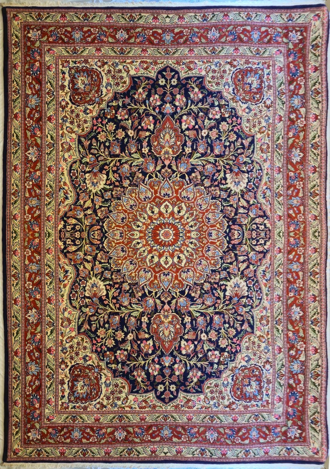Handmade carpets produced in Sarough are the finest produced in the Arak region of Iran. The handmade carpet tradition has been around in this region for more than one century. Sarough Handmade rugs had their golden age in the 1920's when this Sarough handmade rugs became very popular in the United States. Most of the designs in those times and today have a central floral bouquet with a field containing vases, palmettes and detached floral sprays. Sarough handmade rugs employ excellent quality lustrous wool. Primary Sarough handmade rugs are navy blue, red, cream or pink-salmon. The antique rugs of the 1920's specially in large sizes are sought for by collectors and they can be quite expensive depending on their condition.