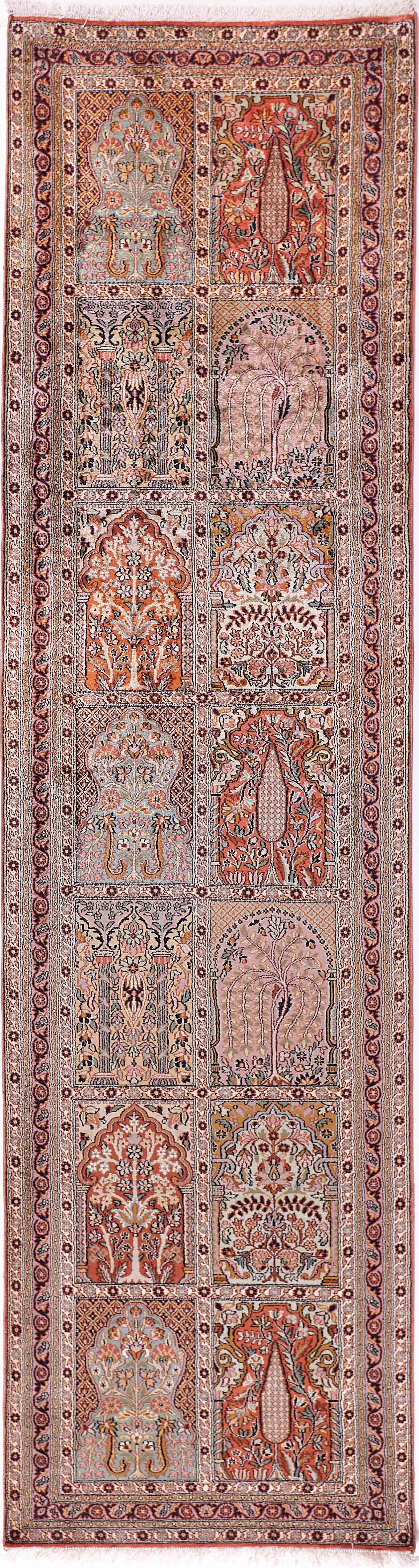 Kashmir region has been producing rugs for about four hundred years probably due to the influence of the the first Muslim ruler of Kashmir, Shah Mir in 1349 and the Mughals, who ruled from 1526 until 1751. However, the commercial carpet industry really began to developed in the late 19th century. The finest silk rugs produced in India are found in Srinagar, Kashmir. Most designs have adopted patterns and designs introduced from Persia. Kashmir silk rugs mainly use curvilinear floral patterns employing the Shah Abbas motifs either with a central medallion or an all-over pattern, employing a field filled with crowded flowers, palmettes, and vines. Kashmir rugs are renowned to have bright, jewel-like color tones such as sapphire blue, ruby red, emerald green, aquamarine, amethyst, and ivory. Rugs from Kashmir traditionally employ oriental, floral designs that typically utilize motifs such as the boteh motifs, Central medallion, Prayer rug pattern, tree-of-life, panel Garden designs which are typically found in the more expensive Qom rugs. Kashmir rugs are made in a range of sizes and qualities. The usual quality found is what is referred to as a 16/16 (16 knots by 16 knots) per square inch or an 18/18(18 knots by 18 knots)per square inch. In metric this would be 360.000knots/m2 and 500.00knots/m2 respectively. These qualities usually are not so durable and may have a mixture of mercerized cotton(‘art silk’) and natural silk in the pile which considerably reduces the durability and price of the rug. The warp and weft of 16/16 and 18/18 rugs are usually cotton. At Bizsan we recommend the higher quality 24/24 (24 knots by 24 knots) or 26/26(26 knots by 26 knots)per square inch(approximately 900.000-1000.000knots/m2) because genuine pure unmixed silk is used for the pile and the warp making the rug more durable and valuable in the long run. These qualities begin to be comparable to the Iranian Qom rugs but are much lower in price than there counterpart. In the last few years Kashmir rugs are becoming the preferred silk rug due to the limited numbers of silk rugs produced in Qom, Iran and the much higher prices Qom’s rug are demanding on the market.