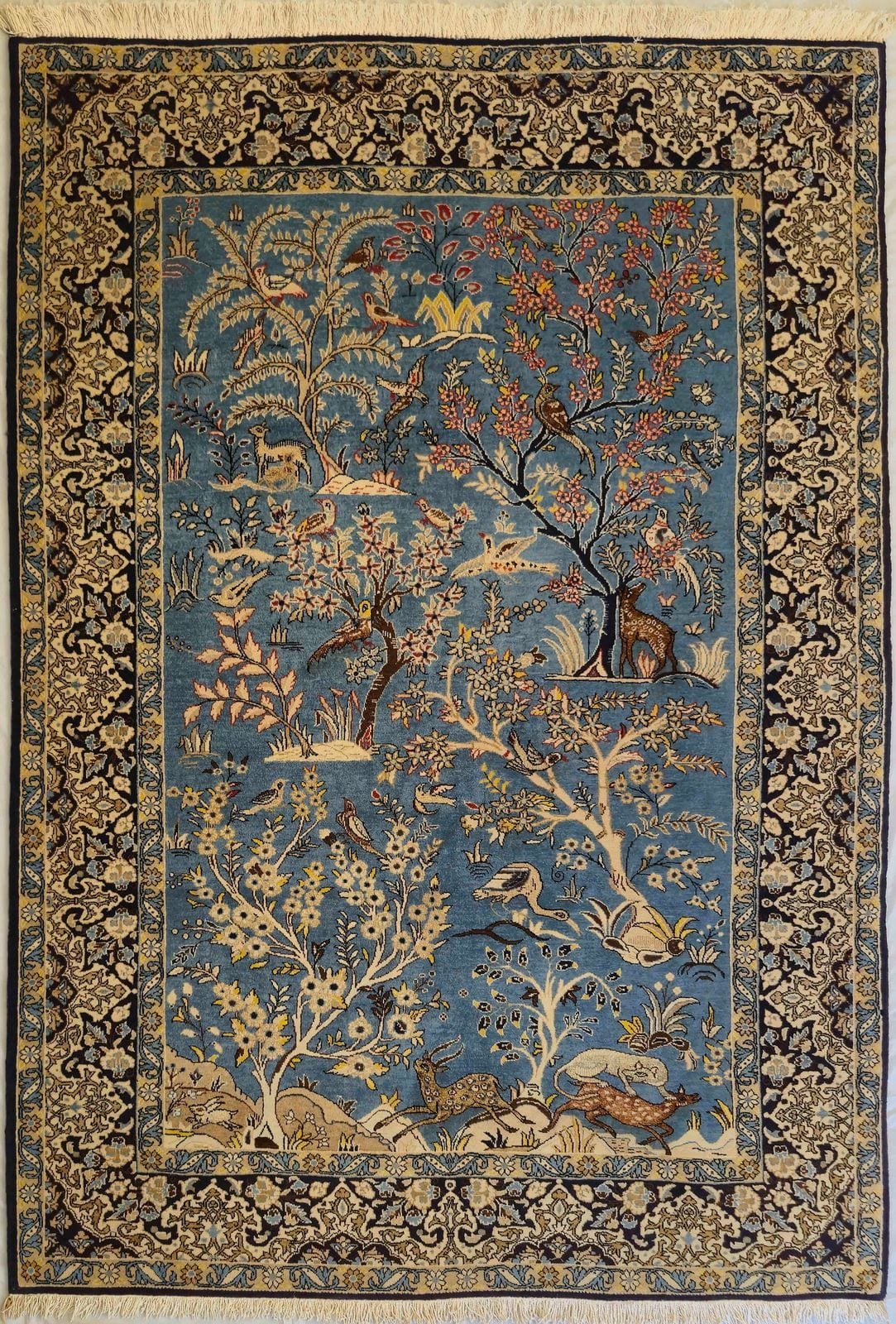 Ghom(Qom) This is a rug production area approximately 150 km south of Tehran. This city(Qom) is also one of the holiest cities of Iran. Production of rugs started in 1930′s by Kashan weavers. Both wool and silk rugs are produced, however Qom recently became famous for its unique silk designs produced by a host of master workshops in this city. Today Qom is the producer of the greatest number of silk rugs with the most variety of designs produced in the world. These exceptional pieces represent the highest level of craftsmanship utilizing the finest quality of wool and silk available for the pile. The designs are crisp and well executed. The designs utilize figurative designs(depicting hunting patterns), garden of paradise, tree of life, or typical central medallion sometimes reminiscent of the unique motifs of Persian tile-filled domes in mosques and old bazaars. Prices for this exclusive pieces may range according to quality, workshop name and fame, and the general beauty of design executed in the field of the rug. The typical pieces are 800 000-1100 000 knots per square meter however there are unique pieces that are woven up to 1.500.000knots/m2. All sizes are woven from prayer mats to large hall pieces(2x3m,3x4m,and larger).