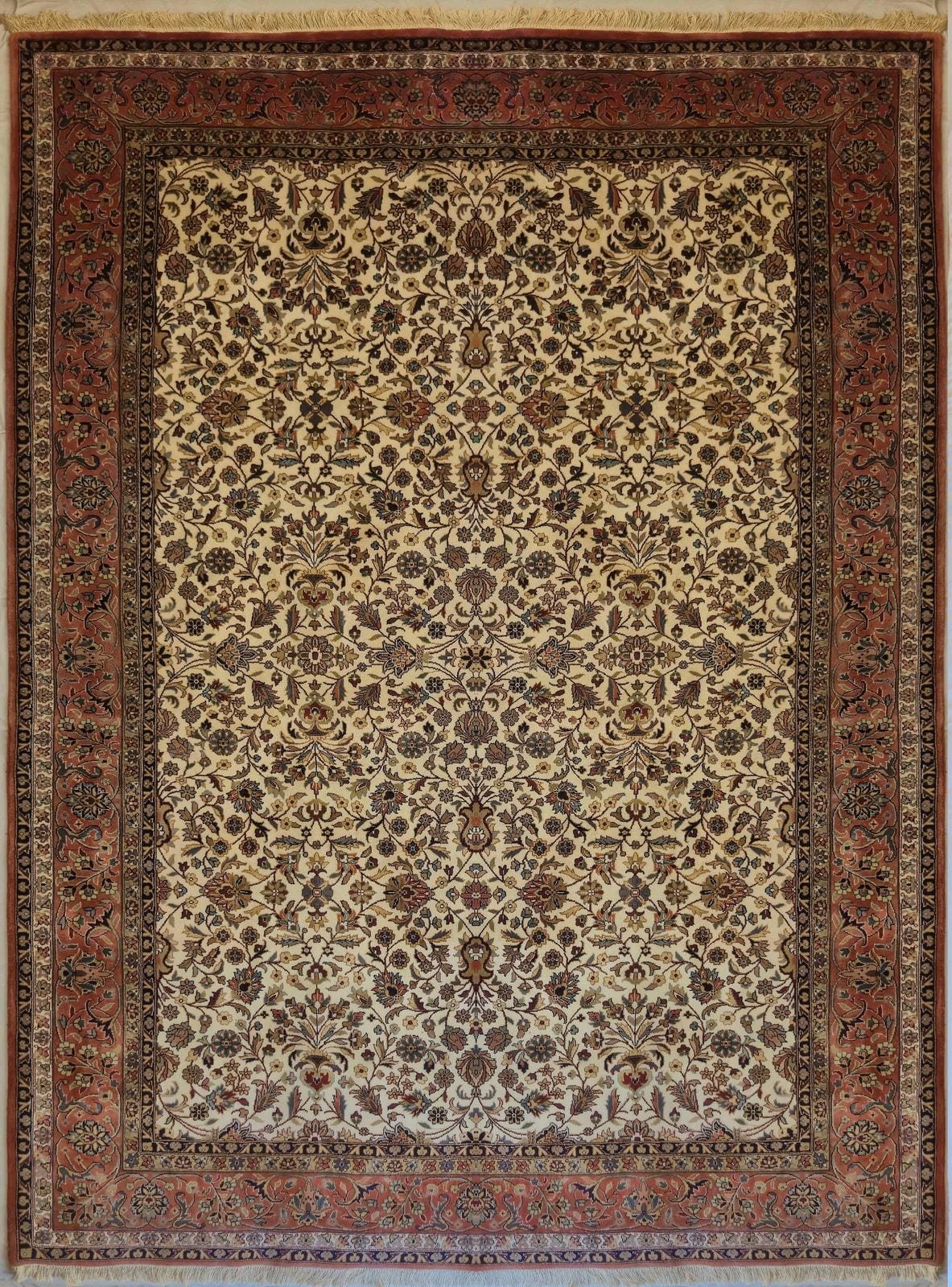 Handmade carpets produced in Sarough are the finest produced in the Arak region of Iran. The handmade carpet tradition has been around in this region for more than one century. Sarough Handmade rugs had their golden age in the 1920's when this Sarough handmade rugs became very popular in the United States. Most of the designs in those times and today have a central floral bouquet with a field containing vases, palmettes and detached floral sprays. Sarough handmade rugs employ excellent quality lustrous wool. Primary Sarough handmade rugs are navy blue, red, cream or pink-salmon. The antique rugs of the 1920's specially in large sizes are sought for by collectors and they can be quite expensive depending on their condition.